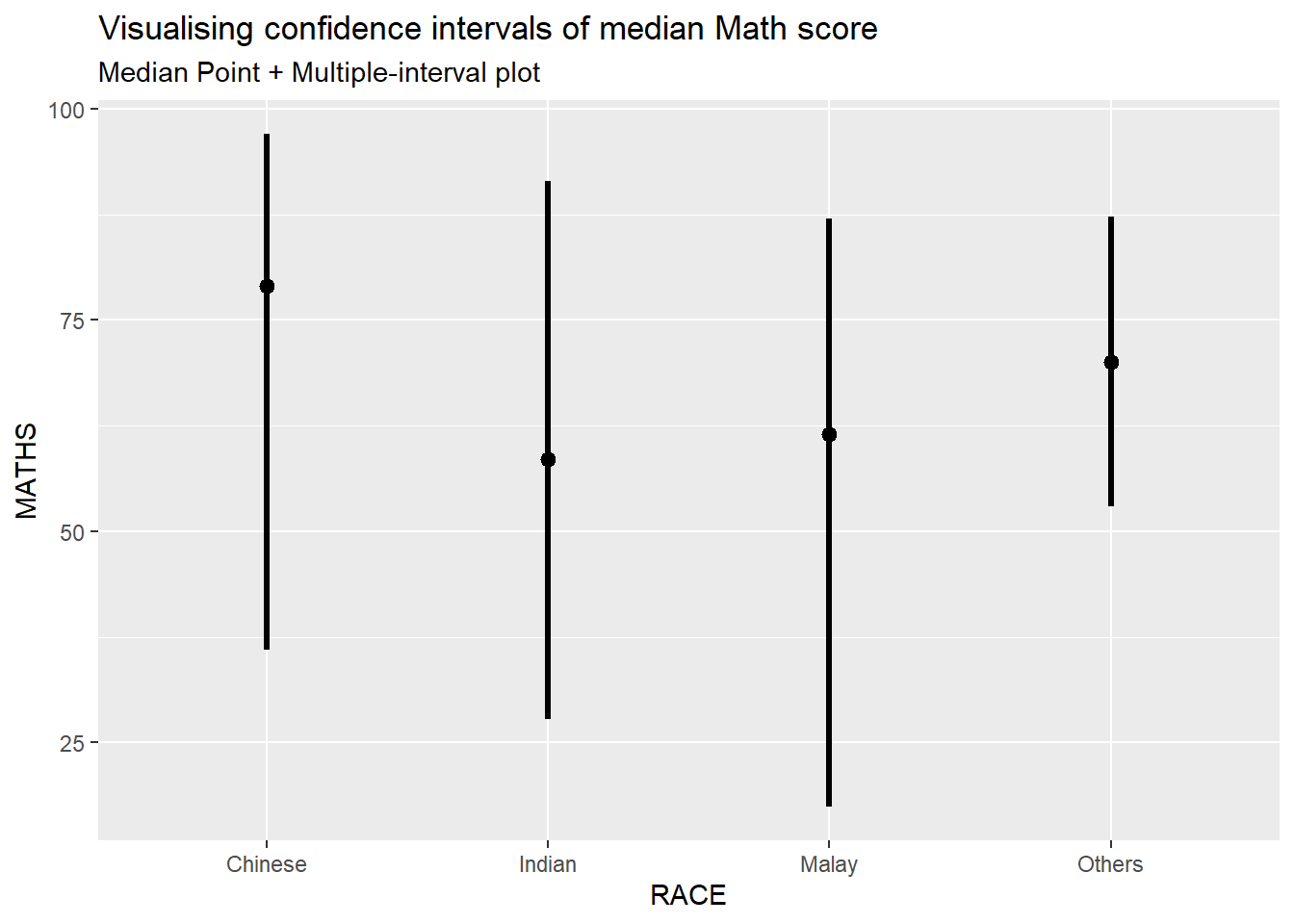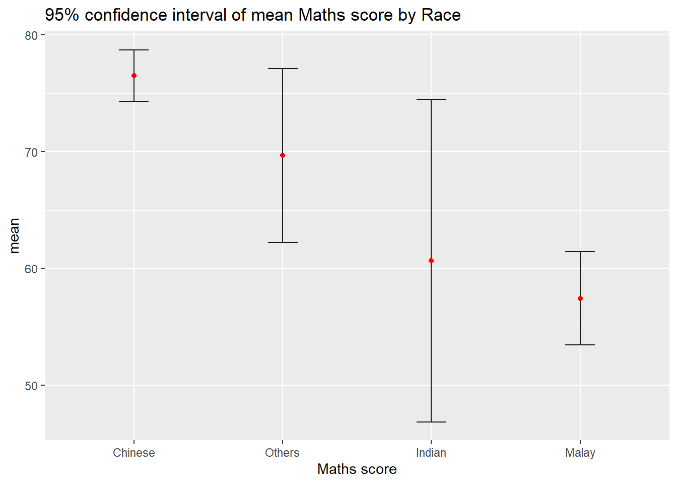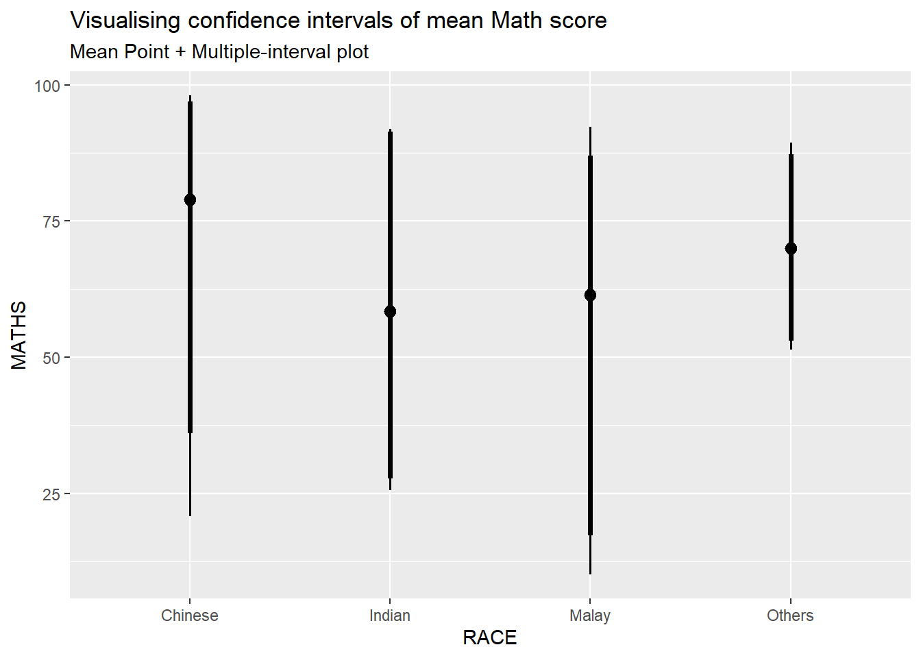 In this section, you will learn how to plot error bars of maths scores by race by using data provided in exam tibble data frame.