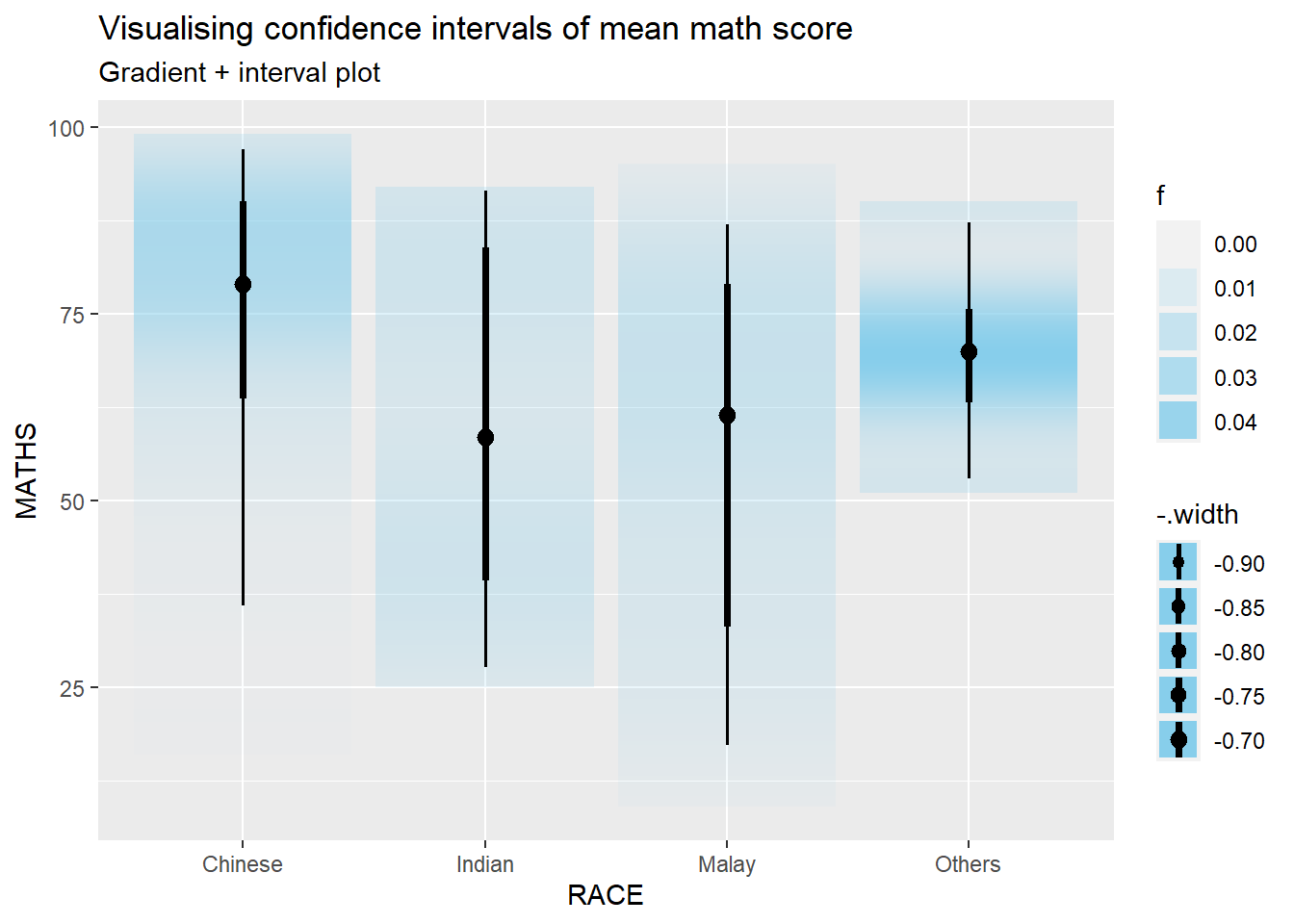 In the code chunk below, [`stat_gradientinterval()`](https://mjskay.github.io/ggdist/reference/stat_gradientinterval.html) of **ggdist** is used to build a visual for displaying distribution of maths scores by rac