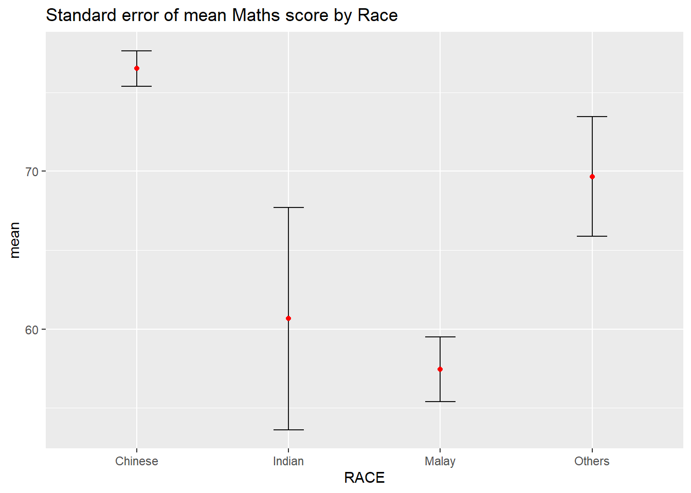 Now we are ready to plot the standard error bars of mean maths score by race as shown below.