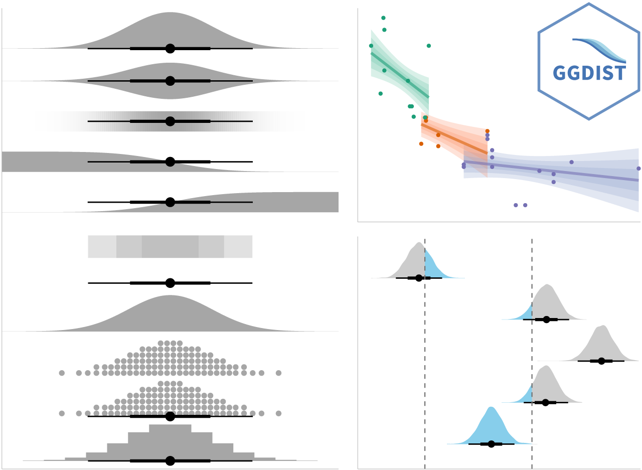 - [**ggdist**](https://mjskay.github.io/ggdist/) is an R package that provides a flexible set of ggplot2 geoms and stats designed especially for visualising distributions and uncertainty.