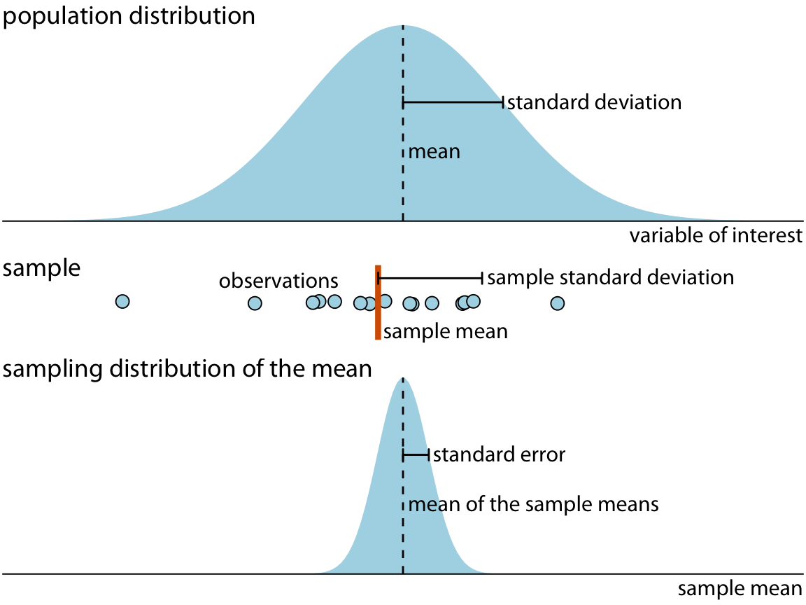 | *A sample will consist of a set of specific observations. The number of the individual observations in the sample is called the sample size. From the sample we can calculate a sample mean and a sample standard deviation, and these will generally differ from the population mean and standard deviation. Finally, we can define a sampling distribution, which is the distribution of estimates we would obtain if we repeated the sampling process many times. The width of the sampling distribution is called the standard error, and it tells us how precise our estimates are. **In other words, the standard error provides a measure of the uncertainty associated with our parameter estimate.** As a general rule, the larger the sample size, the smaller the standard error and thus the less uncertain the estimate.*