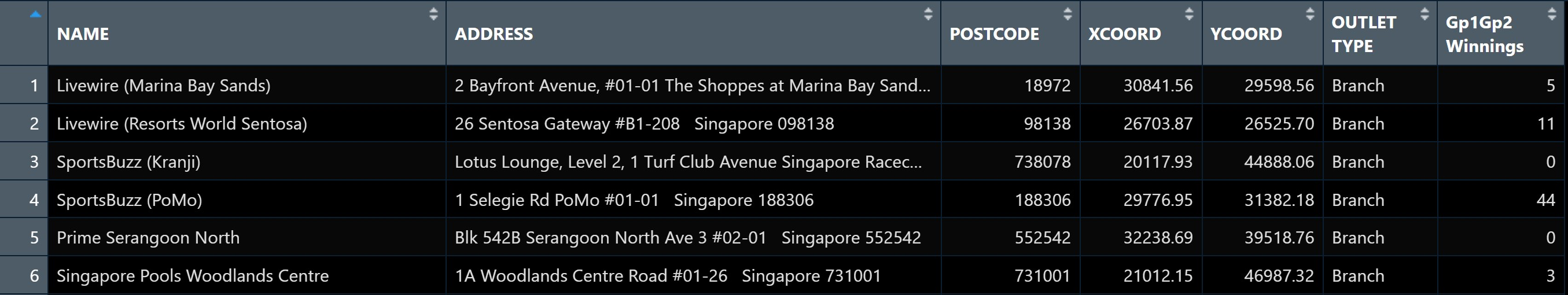 Figure below shows the first 15 records of SGPools_svy21.csv. It consists of seven columns. The XCOORD and YCOORD columns are the x-coordinates and y-coordinates of SingPools outlets and branches. They are in Singapore SVY21 Projected Coordinates System.