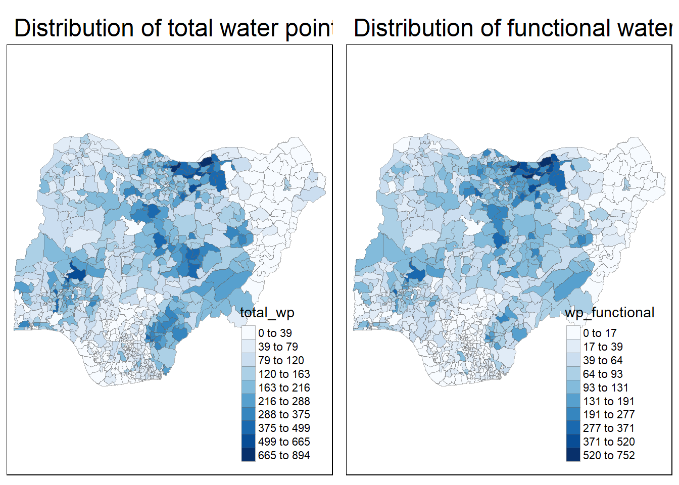 In much of our readings we have now seen the importance to map rates rather than counts of things, and that is for the simple reason that water points are not equally distributed in space. That means that if we do not account for how many water points are somewhere, we end up mapping total water point size rather than our topic of interest.