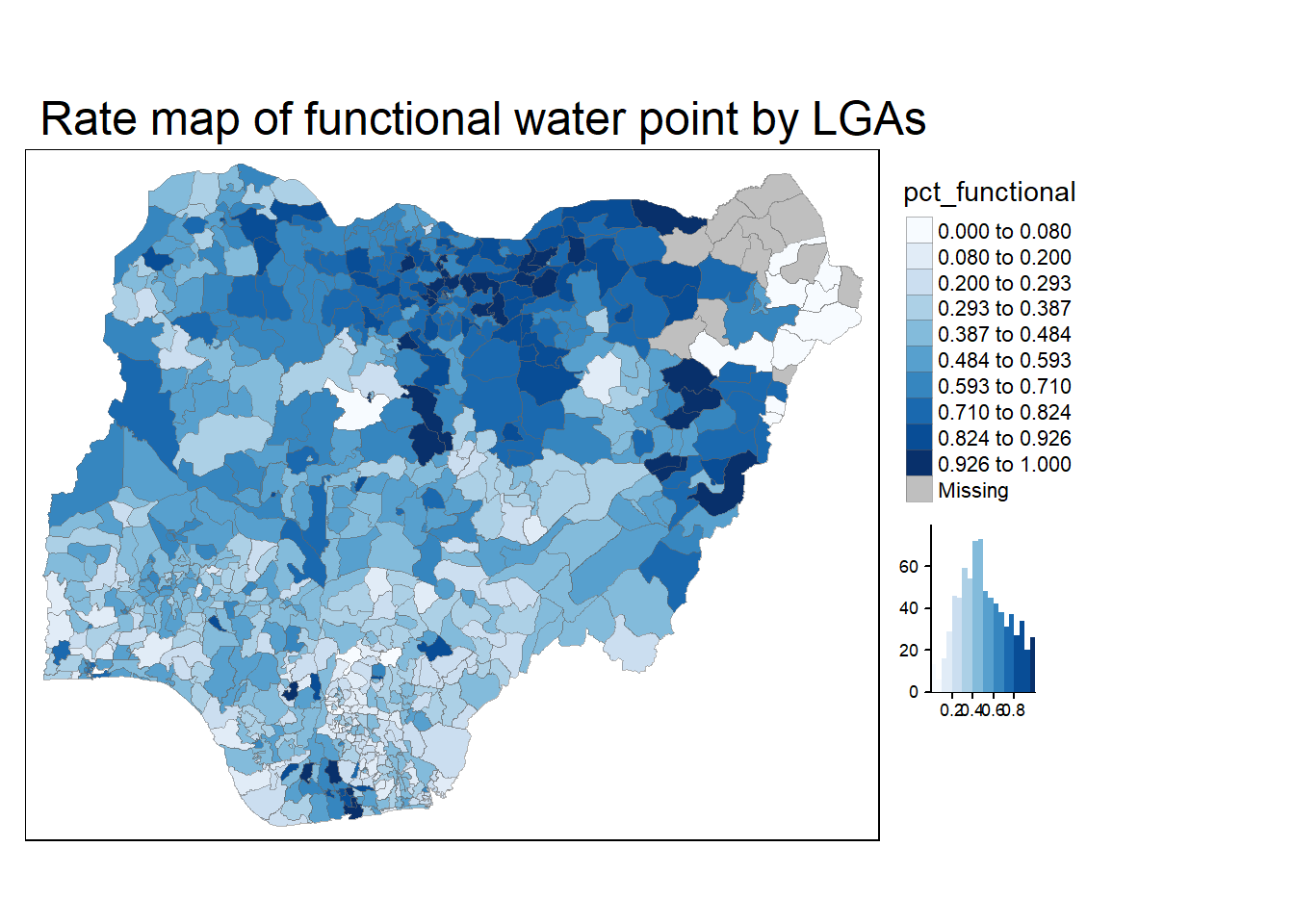 tm_layout(main.title = "Rate map of functional water point by LGAs",