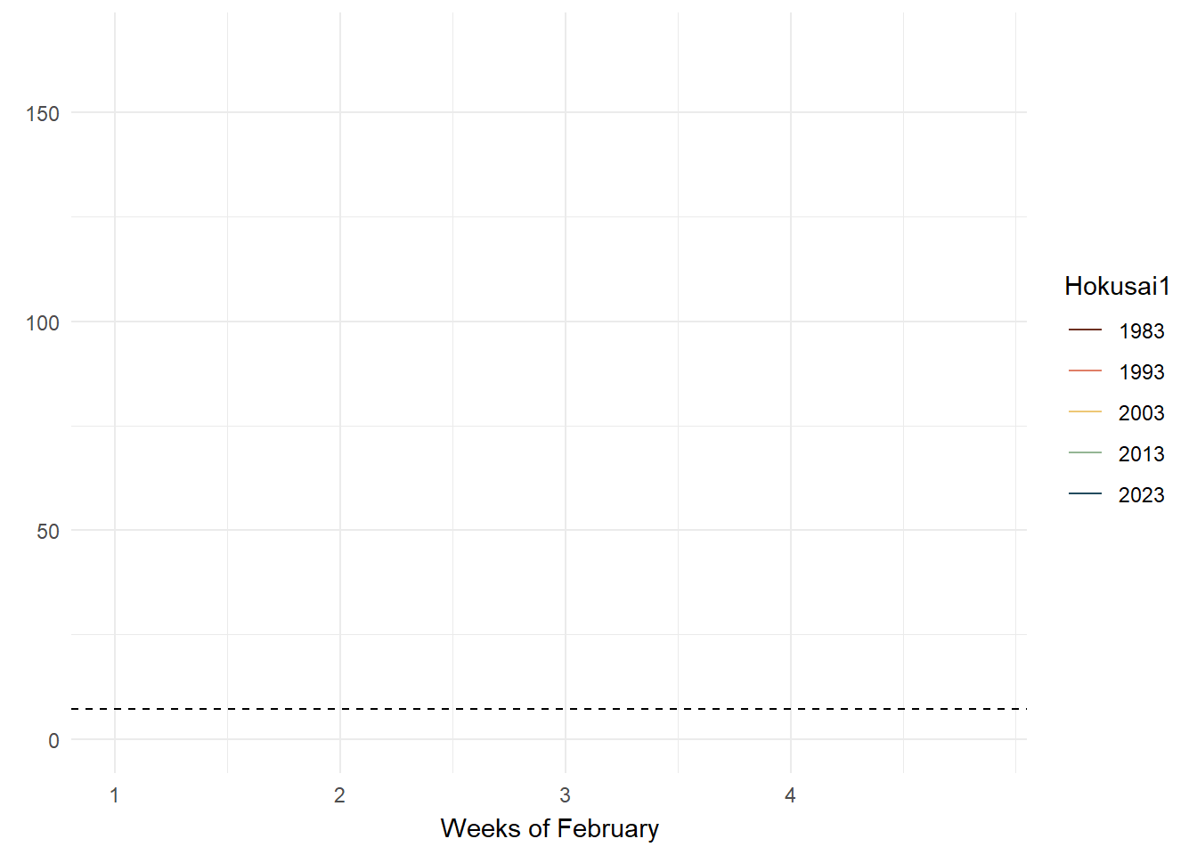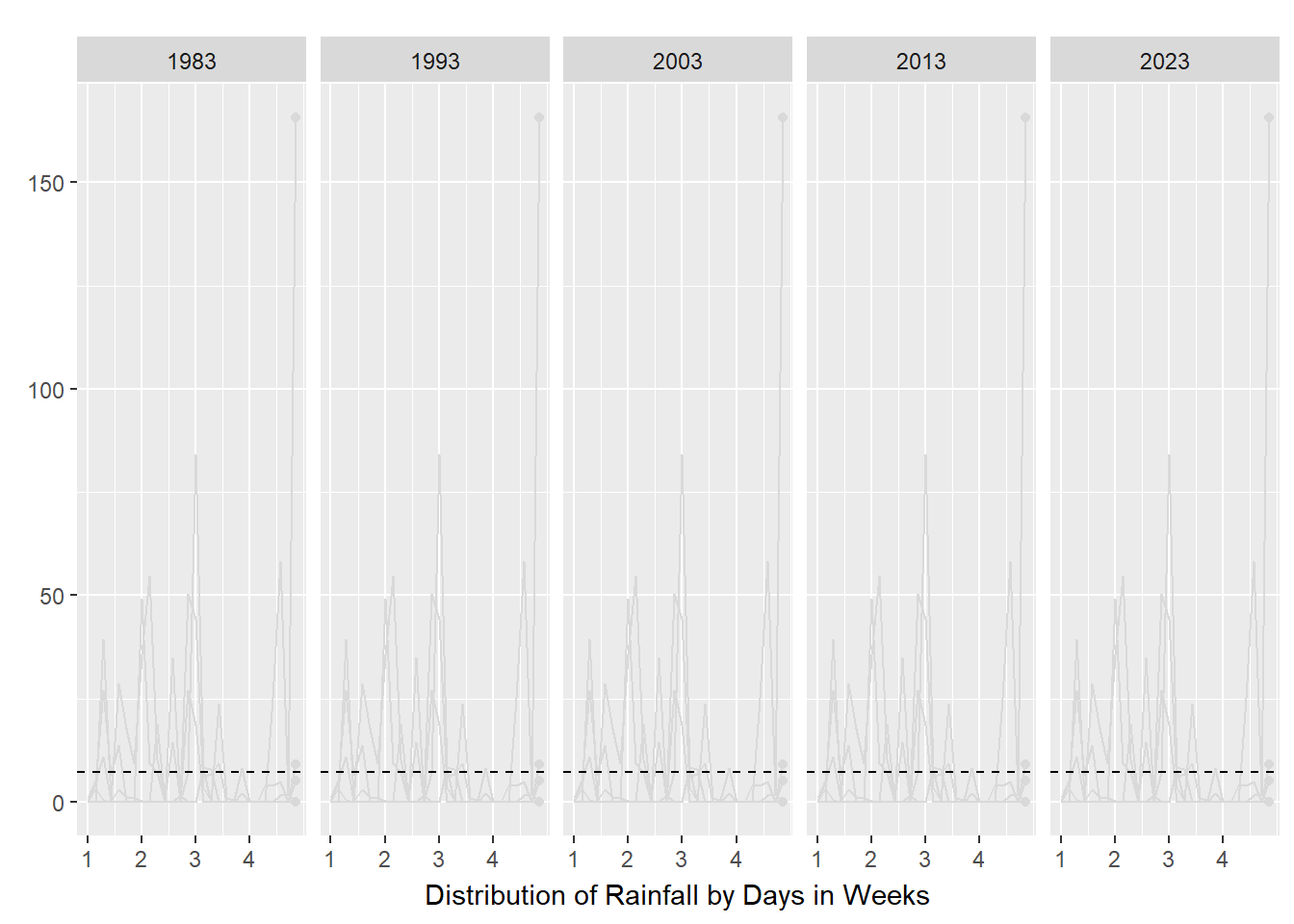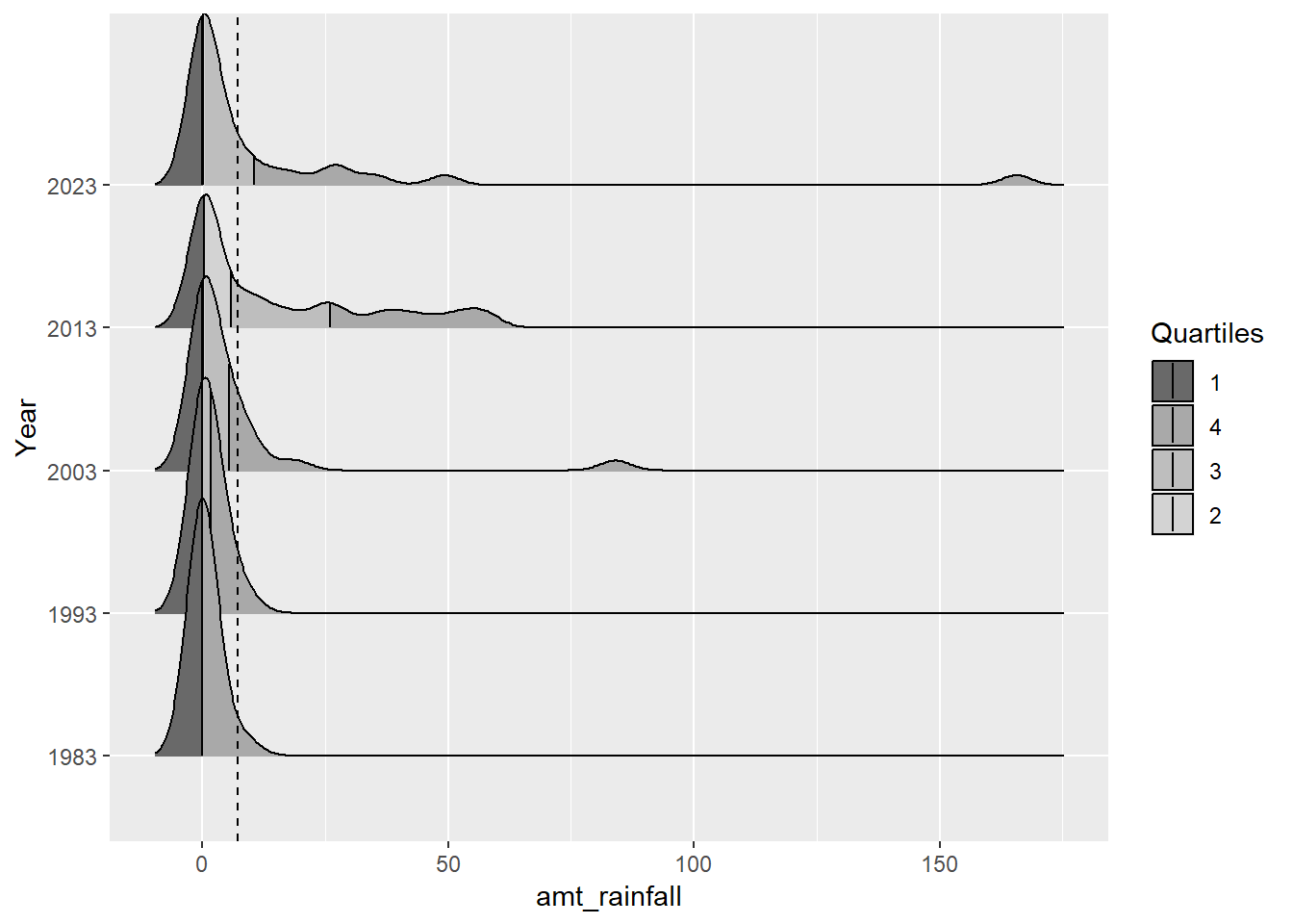 patchwork()andsubplot()were very limited in its layout.With limited data sample, it was difficult to plot the distribution especially since it was a dry month and there were many duplicated days of 0.0mm. This was challenging and only the blip year 2013 had 4 quartiles(!) while the year 1983 only had 2 quartiles! It was very weird.