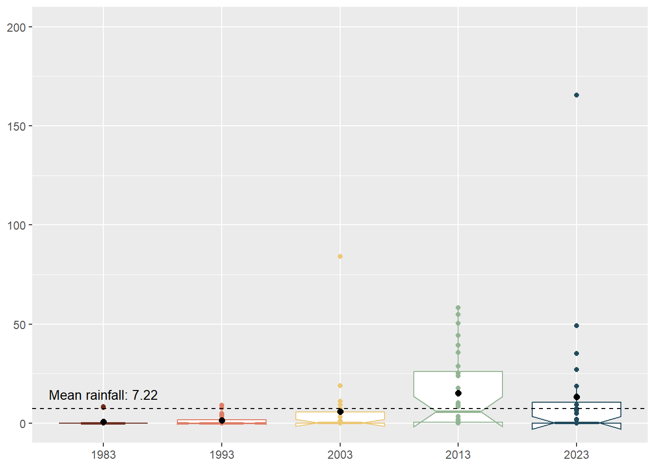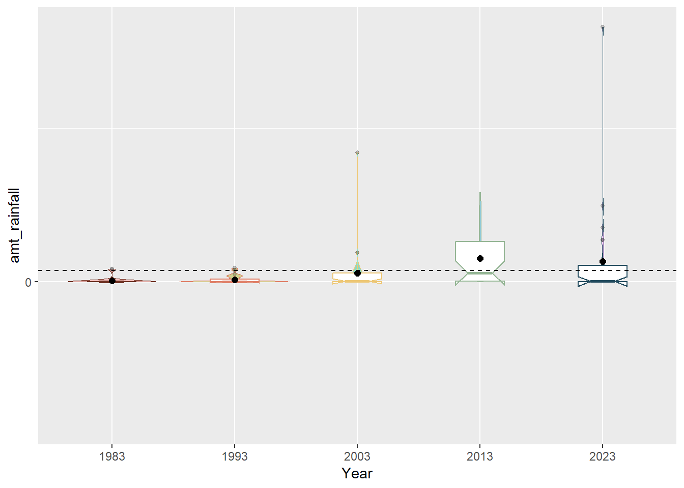 box_plot <- ggplot(rainfall, aes(x = Year, y = amt_rainfall, color = Year)) +