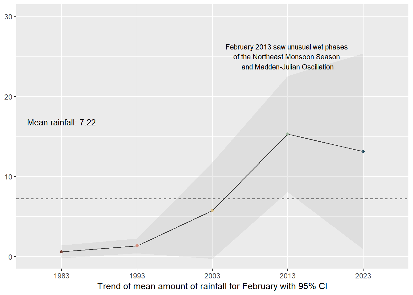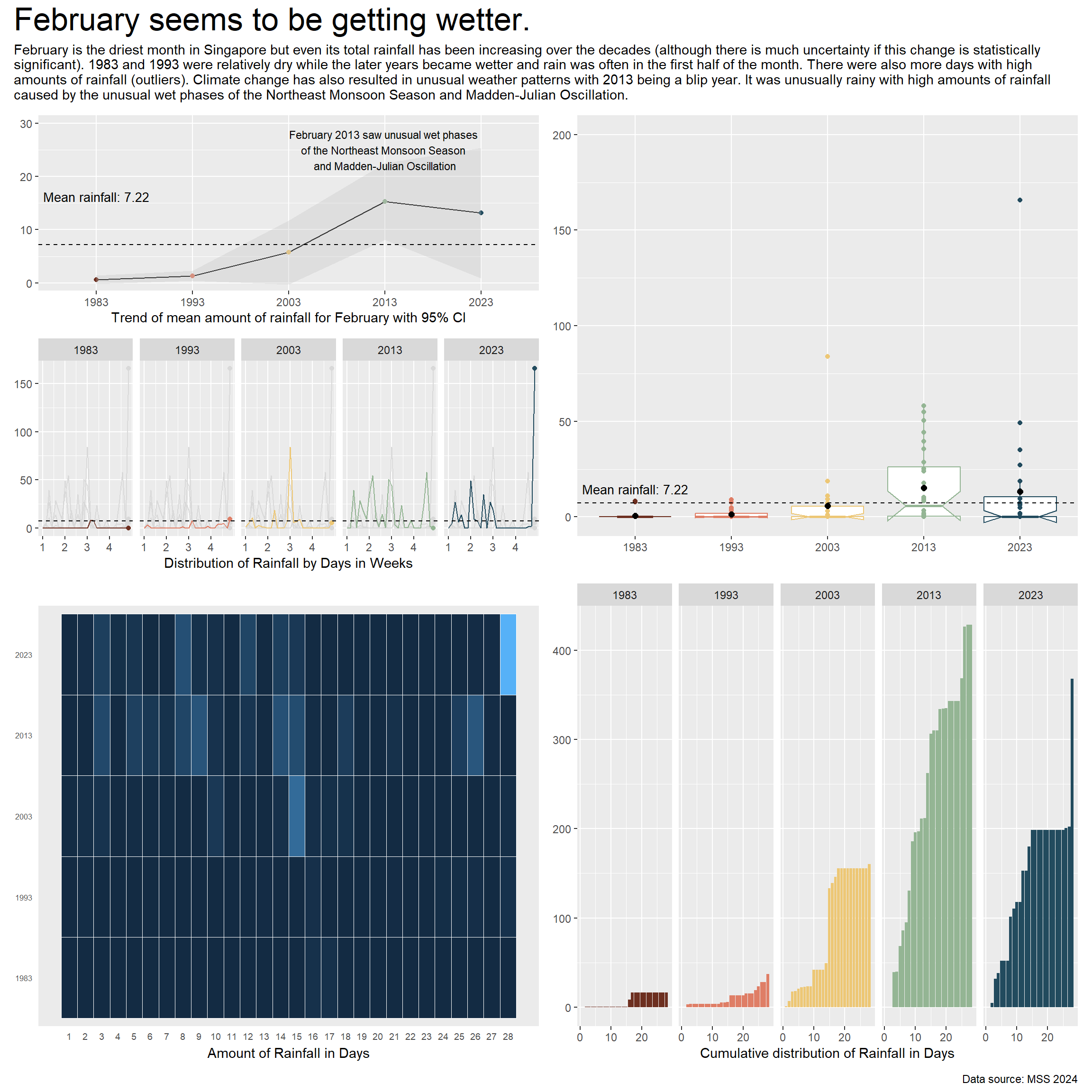 subtitle = "February is the driest month in Singapore but even its total rainfall has been increasing over the decades (although there is much uncertainty if this change is statistically \nsignificant). 1983 and 1993 were relatively dry while the later years became wetter and rain was often in the first half of the month. There were also more days with high \namounts of rainfall (outliers). Climate change has also resulted in unusual weather patterns with 2013 being a blip year. It was unusually rainy with high amounts of rainfall \ncaused by the unusual wet phases of the Northeast Monsoon Season and Madden-Julian Oscillation.",