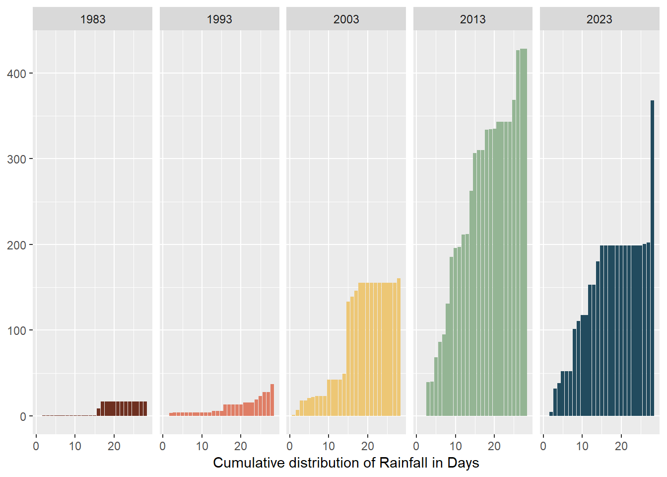 ch_rainfall <- ggplot(rainfall_cumulative, aes(x = Day, y = cumulative_count, group = Year, fill = Year)) +