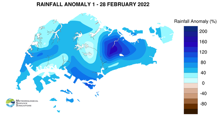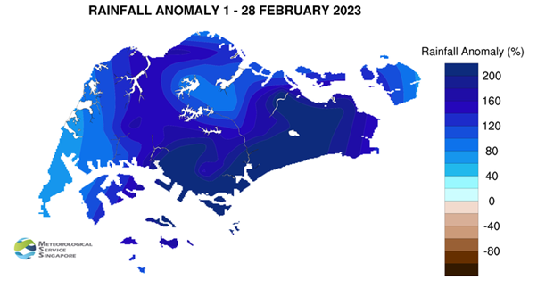 However, MSS (1 March 2023) reported that 2023 also saw the wettest day on record for February - “225.5mm recorded at Kallang… [and] was the highest daily total rainfall ever recorded in February, exceeding the previous record of 159.3mm on 4 February 1995”. Rainfall anomaly saw that well above average rainfall happened in February 2023 as seen in the image below.