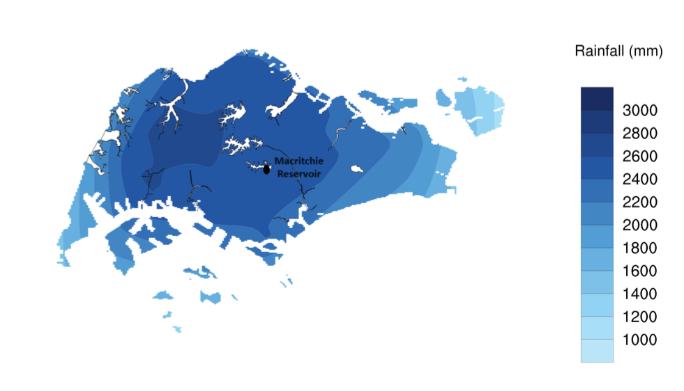Given the criteria that we need to collect rainfall data from 1983 to 2023, only 19 weather stations met the criteria (you can refer to the link here). While Changi is the official reference station of NEA, MacRitchie Reservoir station was of most interest to me as it is relatively located in the central area of Singapore (as seen in the image below) and is in the second wettest area in Singapore. It is of 1.3417 Lat.(N), 103.8338 Long.(E) and 25m elevation above mean sea-level (you can read more here). MacRitchie Reservoir is also the first water supply system in Singapore as part of the Central Catchment Nature Reserve and its water levels are often mentioned in the news during dry spells.