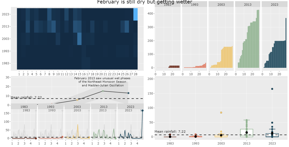 # subtitle = 'February is the driest month in Singapore but even its total rainfall has been increasing over the decades. #1983 and 1993 were relatively dry while the later years became wetter and rain was often in the first half of the month. There #were also more days with high amounts of rainfall. Climate change has also resulted in unusual weather patterns with 2013 being #a blip year. It was unusually rainy with high amounts of rainfall caused by the unusual wet phases of the Northeast Monsoon #Season and Madden-Julian Oscillation.<br>')